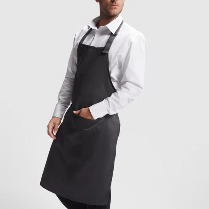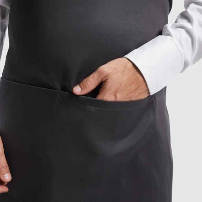 Realizat din material tip twill (serj) de densitate mare, șorțul este rezistent și potrivit pentru utilizare intensivă. Designul inteligent include un buzunar frontal generos, compartimentat în două, ideal pentru organizarea eficientă a ustensilelor sau accesoriilor necesare.